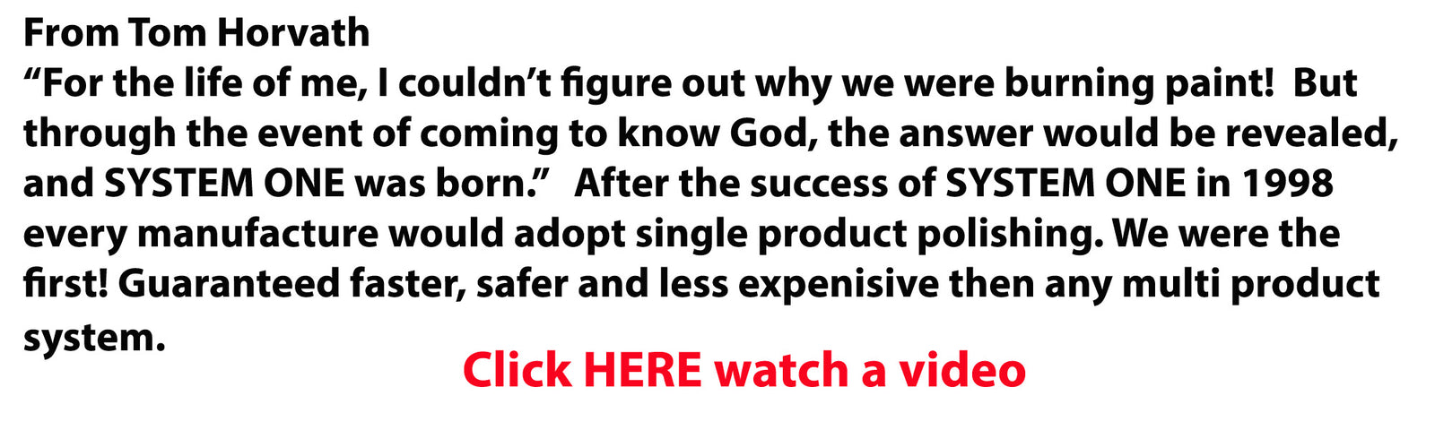SYSTEM ONE was the first company to promote single product polishing to the paint polishing trade many years ago. Learn to remove any scratch that's removable with only ONE polish, no need to ever use compound again.